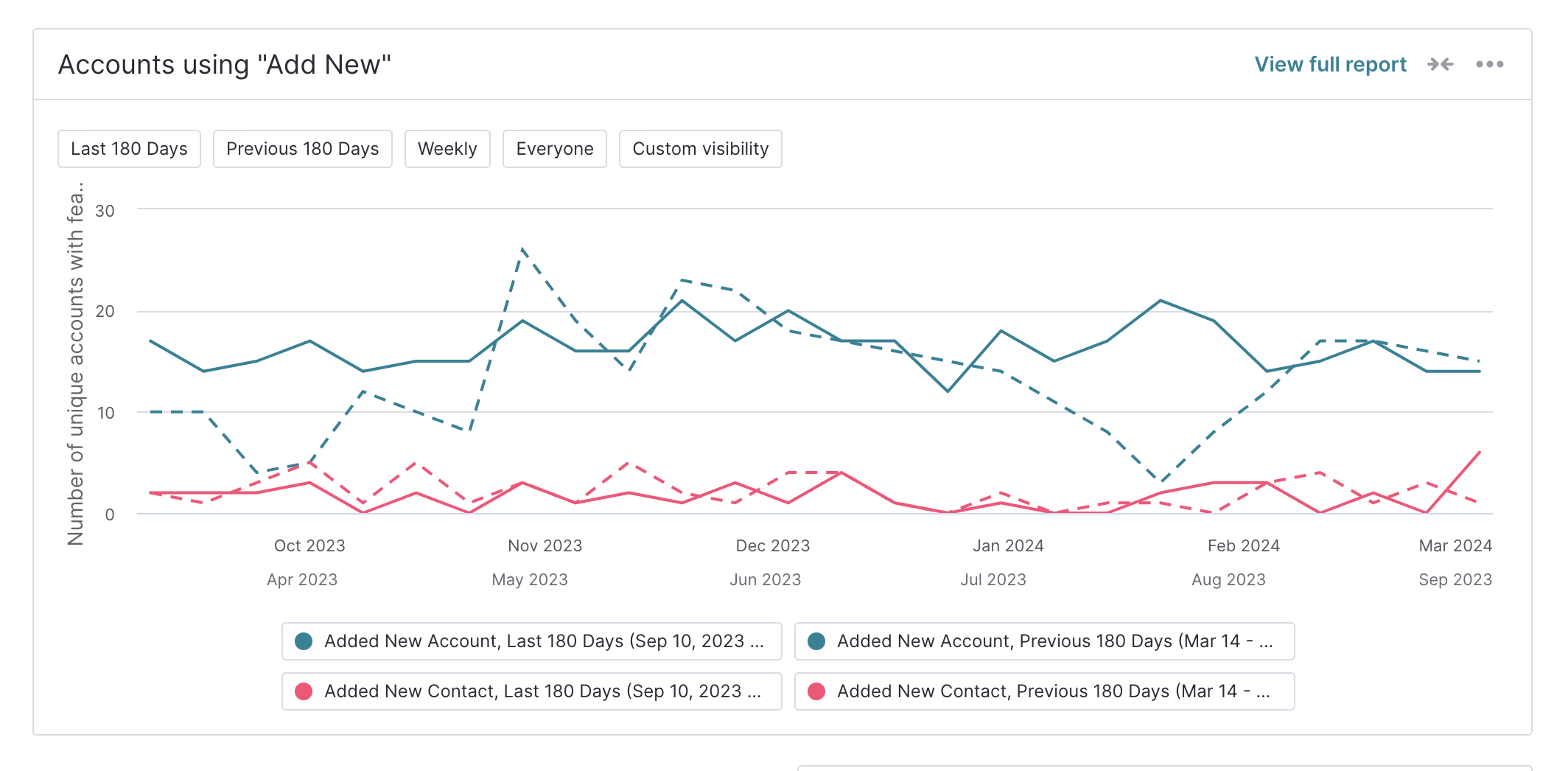 See a data point or item that you want to dig deeper into? Now just click on the link in the upper righthand corner of a widget to take you to the relevant page– whether it’s accounts, visitors, PES, guides, reports, etc.