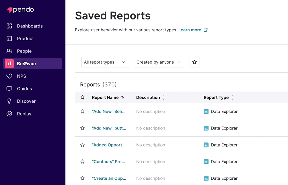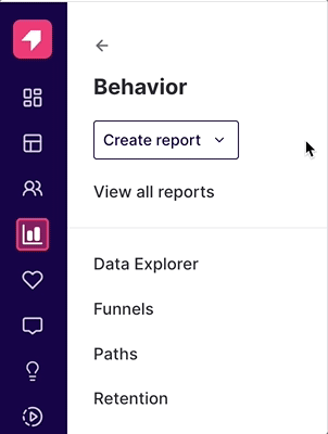 Create any report with just a click from the navigation. Just simply select “create report” in the behavior section, and you can choose from Data Explorer, Funnels, Paths, Retention, or Workflows without having to go to the list pages.