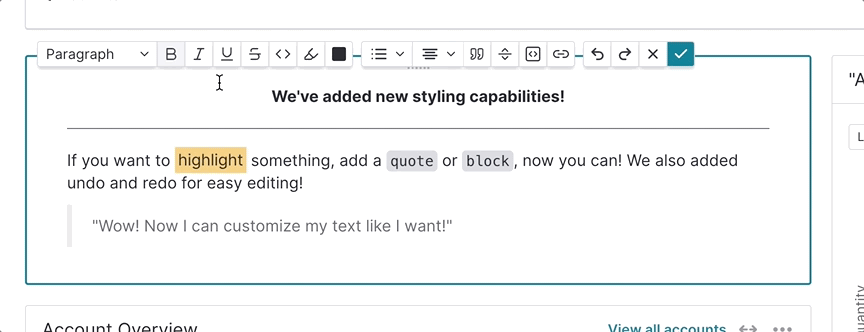 Full list of additions: Strikethrough, code styling, code block, highlight, checklist, alignment to center, right, horizontal rule, quote, half + full width, half + full + flexible heights