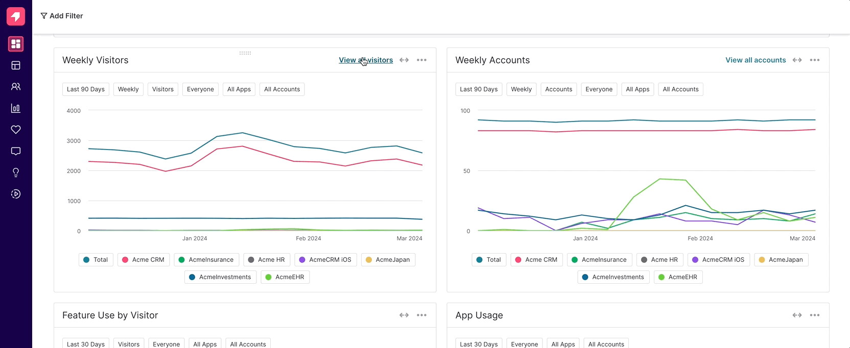 Set a dashboard to be your homepage when you log into Pendo. In the middle of a feature launch, or want to monitor your area’s KPIs every time you log in? Set as home and always be able to access by clicking the Pendo logo in the nav to take you there.