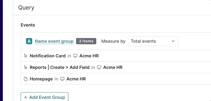 We know “Group A” and “Group B” don’t mean much when you are analyzing your data, so we have added the ability to name your event groups in the Data Explorer query. When using formulas, this will also allow you to see this name in the plain language question format, allowing for more tailored analysis and context– not just for you, but for whoever views your report or chart.