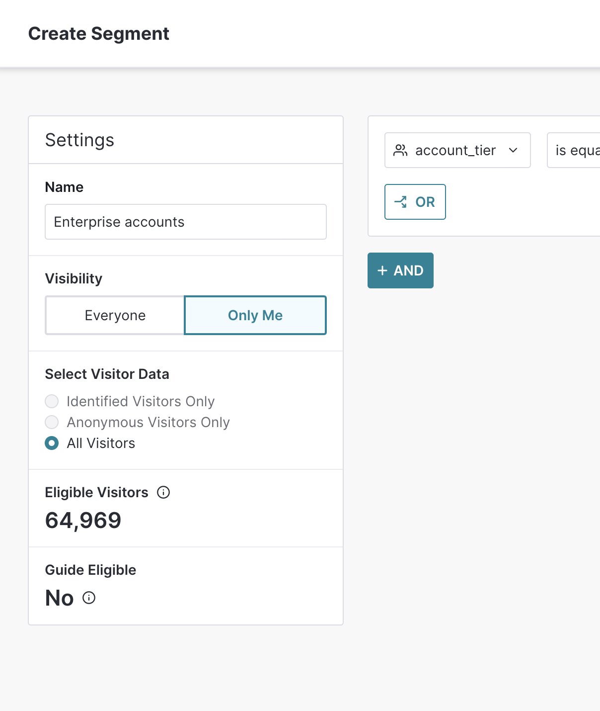 See how many eligible visitors exist for the segment, whether you are in the segment editor, the draft segment editor in reports, the custom segment editor in guides, or in the segment details blade. The count will update in real-time as you edit your segment rules. This count will help you understand the size of your audience whether you are filtering data or targeting a survey.