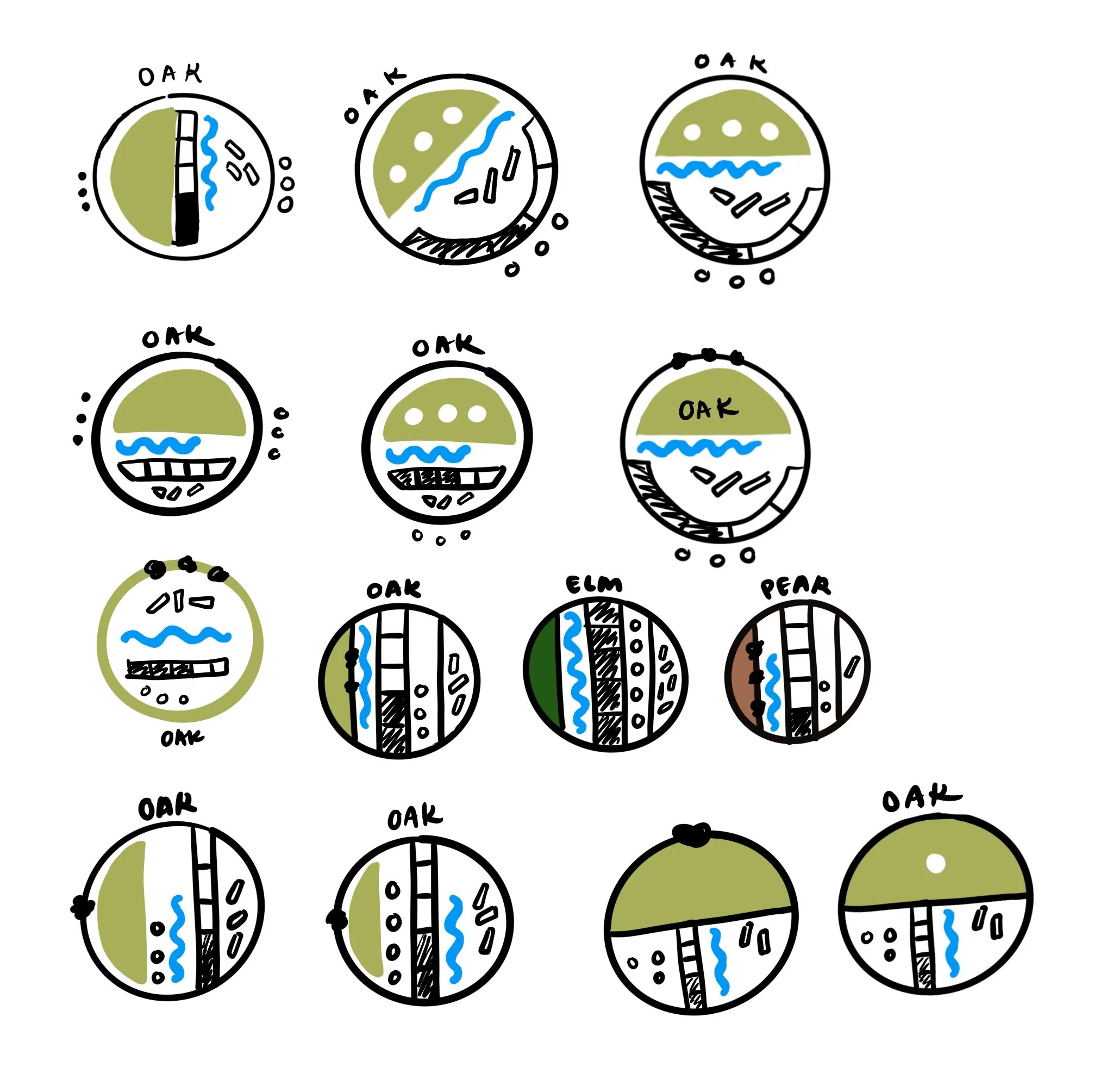 Sketching ideas for visually encoding this information into a unique symbol for each tree